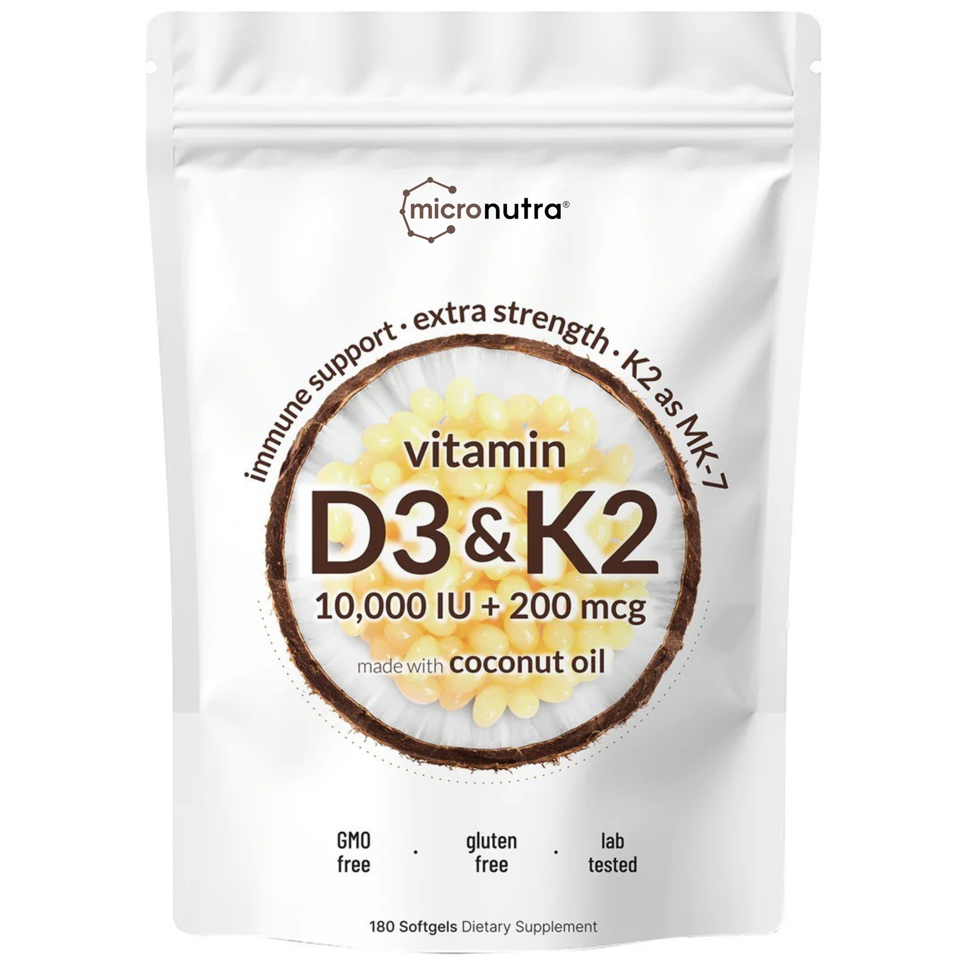 Unlock the synergy of sunshine and circulation with Micro Nutra's perfectly balanced D3 + K2 formula. This double-strength 2-in-1 complex provides 10,000 IU of vitamin D3 and 200 mcg of vitamin K2 in its superior MK-7 form, working together to revolutionize how your body uses calcium. While D3 enhances calcium absorption, K2 guides it to your bones and teeth while keeping it away from your arteries Micro Nutra.